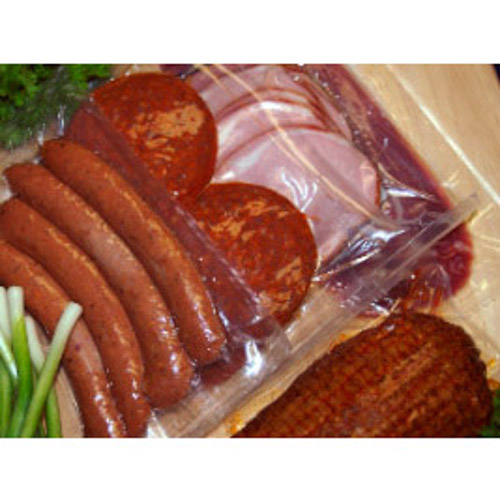 These pouches are used in the vacuum packaging of meat fish poultry cheese and other perishable food products. Our line of top-quality laminated poly nylon pouches provide the highest levels of clarity strength and flexibility. These pouches are three-seal constructed offering excellent barrier properties for both oxygen and moisture vapor transmission resulting in extended shelf life for a variety of food products. All pouches meet FDA and USDA requirements for food contact safety. Sizes are listed by outside dimension.