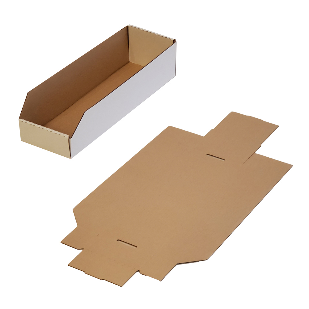 Corrugated, die-cut. 32 ECT #3 white outside. Used for organized storage of parts on standard shelf depths. Rigid self-locking construction. Until ready for use they store flat. Assemble in seconds. All dimensions are outside dimensions.