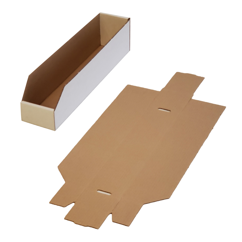 Corrugated, die-cut. 32 ECT #3 white outside. Used for organized storage of parts on standard shelf depths. Rigid self-locking construction. Until ready for use they store flat. Assemble in seconds. All dimensions are outside dimensions.