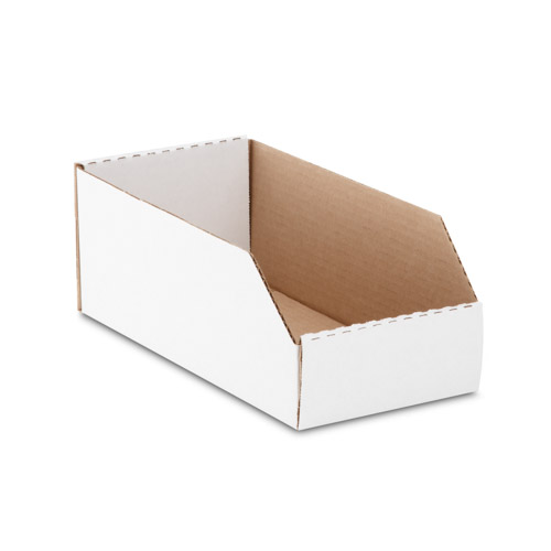 Corrugated, die-cut. 32 ECT #3 white outside. Used for organized storage of parts on standard shelf depths. Rigid self-locking construction. Until ready for use they store flat. Assemble in seconds. All dimensions are outside dimensions.