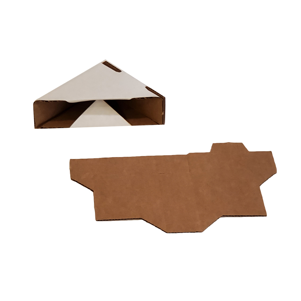 Corrugated, die-cut. 125# test #3 white outside. Furnished flat. No tape, glue or staples necessary. Assemble in seconds. Used for corner protection. All dimensions are inside.