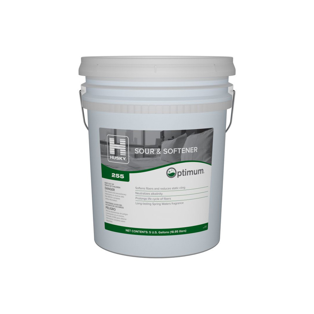 Husky Optimum 255 Sour and Softener is designed to neutralize alkalinity and condition fabrics in a single laundry step. This dual action formula helps balance wash chemistry while softening fibers for improved fabric feel. It supports reduced cycle time and simplified dispensing in commercial laundry operations. The product leaves fabrics soft and static free after the final rinse.