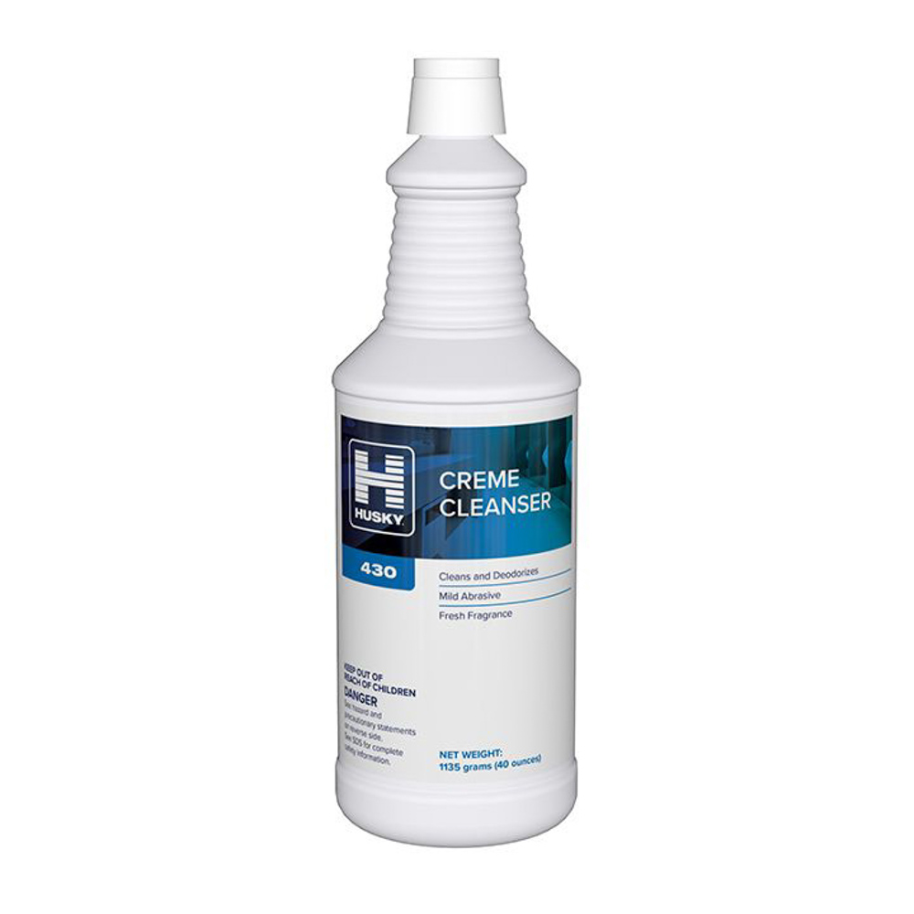 Husky 430 Creme Cleanser is designed to remove stubborn stains, rust, grease, soap scum, and rubber heel marks from hard surfaces. The mild abrasive formula cleans effectively while polishing during use for improved surface appearance. It is safe for use on porcelain, ceramic, and stainless steel in restroom and food service areas. The cleanser leaves surfaces clean and fresh after routine maintenance.