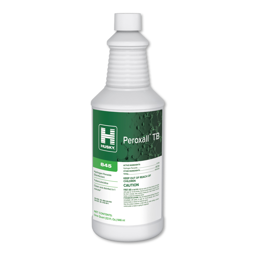 Husky 845 Peroxall TB is designed to provide broad spectrum disinfection for healthcare and commercial environments. This ready to use hydrogen peroxide disinfectant delivers one step cleaning and disinfection with a 1 minute contact time for many common organisms. The formula is effective against bacteria, viruses, and fungi on hard non porous surfaces. Well suited for hospitals, long term care, schools, veterinary, and general facility cleaning programs.