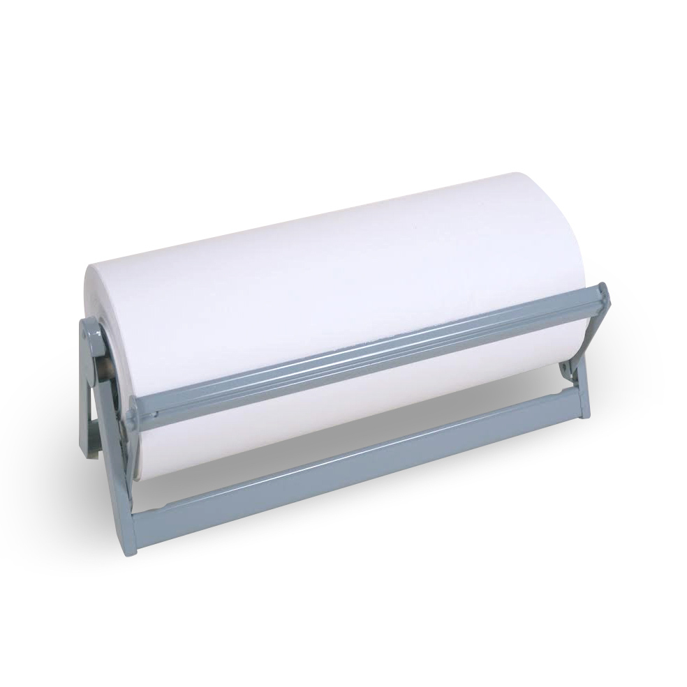 Dispenses many types of paper including butcher, kraft, and giftwrapping papers. It cuts evenly, using either side of the double-edged, spring-loaded blade. Holds up to 9" diameter roll. Mounts on a wall, under a counter or on a countertop.