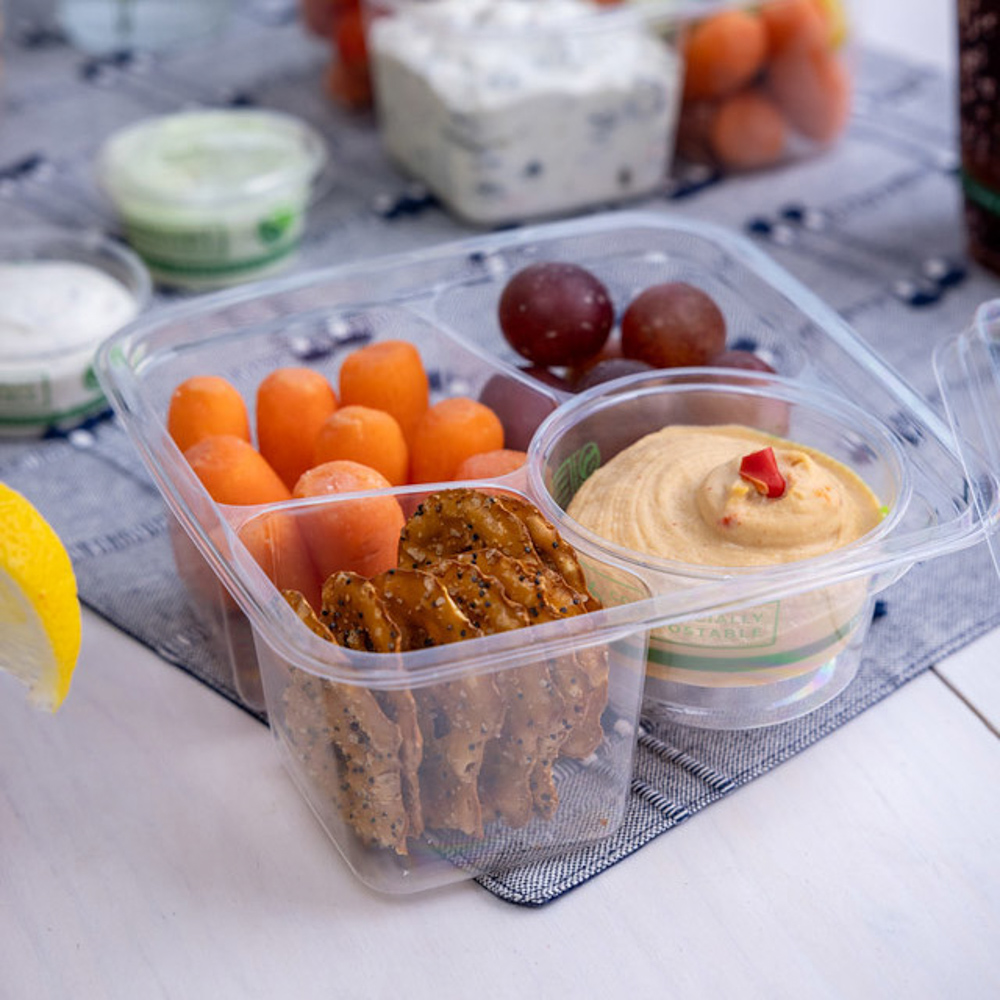 6 x 6 in 3-Cell + Side Well Compostable PLA On-The-Go Boxes are designed for cold food applications and made from PLA, a resin derived from annually renewable plants. These crystal-clear boxes provide excellent visibility, efficient stacking, and sustainable performance for grab-and-go meals and snacks.