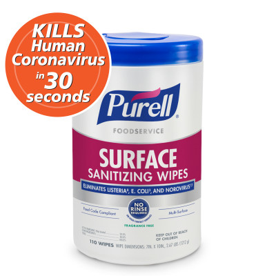 PURELL Foodservice Surface Sanitizing Wipes kill human coronavirus in 30 seconds and are effective against Salmonella, Listeria, Norovirus, and the cold and flu virus. These no rinse wipes are EPA registered, Food Code compliant, and safe for use on food contact surfaces with no fragrance or harsh chemicals.