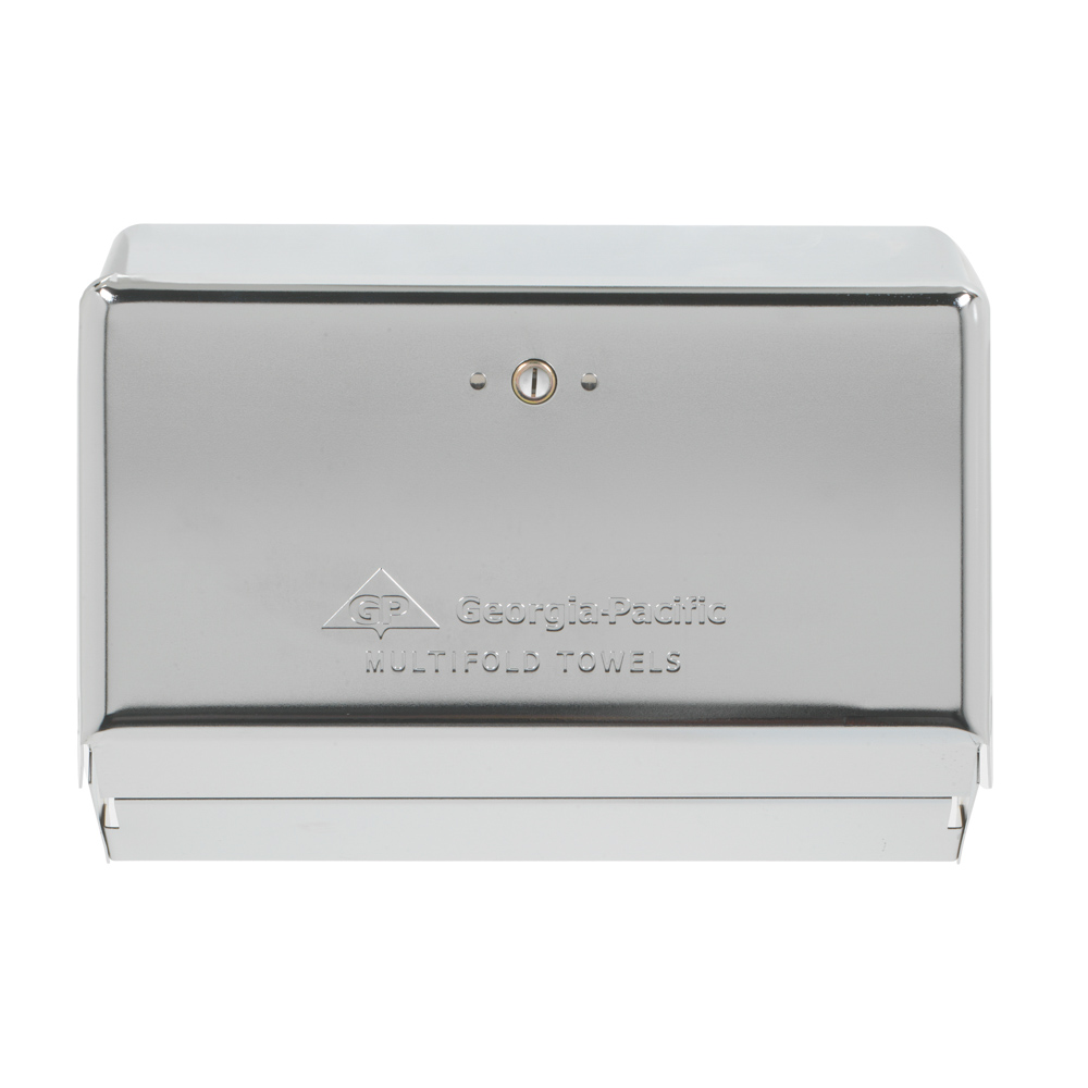 This space-saving metal towel dispenser holds up to 275 standard or 175 senior multifold towels, offering low-cost protection from moisture and contaminants on countertops. The chrome/metal design complements any decor, and its covered, key-lock mechanism guards against waste and pilferage while making refilling quick and easy. Durable steel construction ensures lasting use for economical towel dispensing.