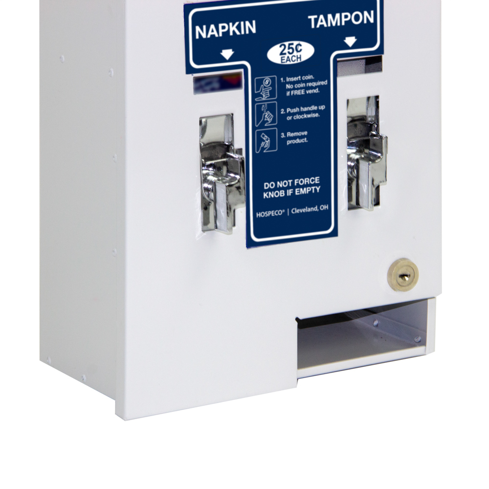 - Dual Dispensing - Vends both sanitary napkins and vend pack tampons