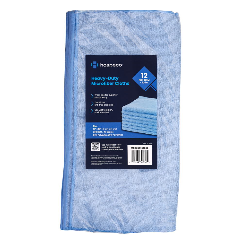 The Hospeco Multipurpose Microfiber Cloth is designed for everyday cleaning with balanced absorbency and streak-free results. Made from 80% polyester and 20% polyamide, its split-fiber construction lifts and traps dirt, lint, and liquids for efficient cleaning on glass, metal, wood, and plastic. Lightweight yet durable, it can be used wet or dry and is machine washable for repeated use. Available in multiple colors to support color-coded cleaning systems and help reduce cross-contamination.