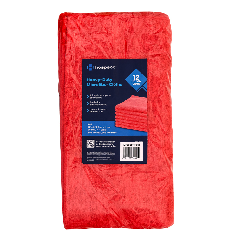 The Hospeco Multipurpose Microfiber Cloth is designed for everyday cleaning with balanced absorbency and streak-free results. Made from 80% polyester and 20% polyamide, its split-fiber construction lifts and traps dirt, lint, and liquids for efficient cleaning on glass, metal, wood, and plastic. Lightweight yet durable, it can be used wet or dry and is machine washable for repeated use. Available in multiple colors to support color-coded cleaning systems and help reduce cross-contamination.