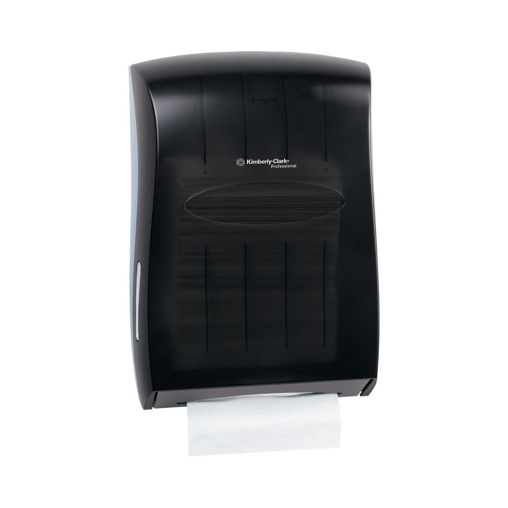 The Kimberly-Clark Professional Universal Folded Towel Dispenser in Smoke (Black) combines sleek styling with durability. Its translucent plastic frame shows when refills are needed, and it works with both multifold and C fold paper towels from trusted brands like Kleenex and Scott. This manual, high-capacity dispenser requires no adaptors, inserts, or batteries, and meets ADA standards when installed properly. Dimensions: 13.3" x 5.9" x 18.9".