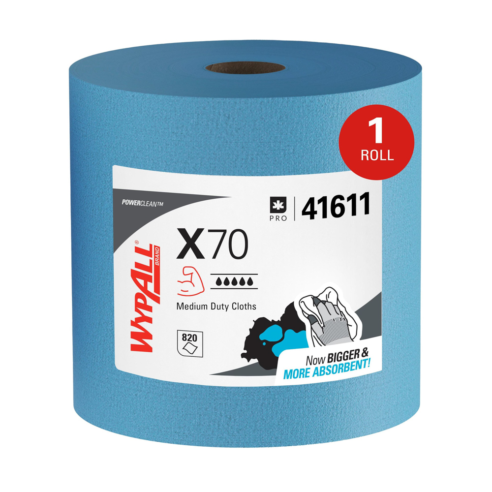 WYPALL* X70 Wipers in a Flat Sheet BX. Durable absorbent wipers that stay strong for better cleaning performance. Reusable long lasting performance. Cleans oil grime and solvents. Made with our high-tech HYDROKNIT* Fast Absorbing Material. Ideal for all manufacturing and maintenance & repair