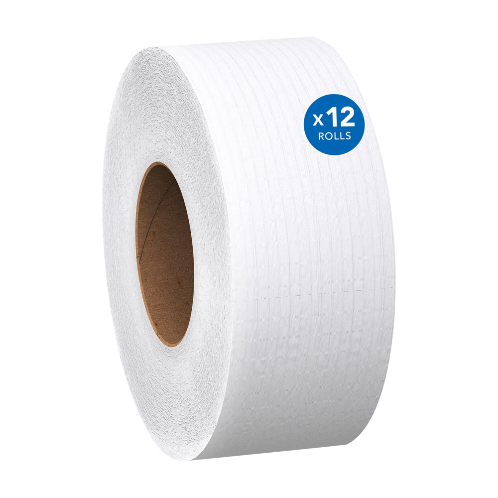 Scott High-Capacity Jumbo Roll Toilet Paper combines efficiency and value, ideal for high-traffic restrooms. Each 2-ply, 1,000-foot roll equals nearly five standard rolls, reducing the need for frequent refills. Compatible with most universal dispensers, it's perfect for industrial, school, or office settings. This eco-friendly, certified product contains 30 percent post-consumer recycled content and meets EPA standards. Durable, absorbent, and budget-friendly