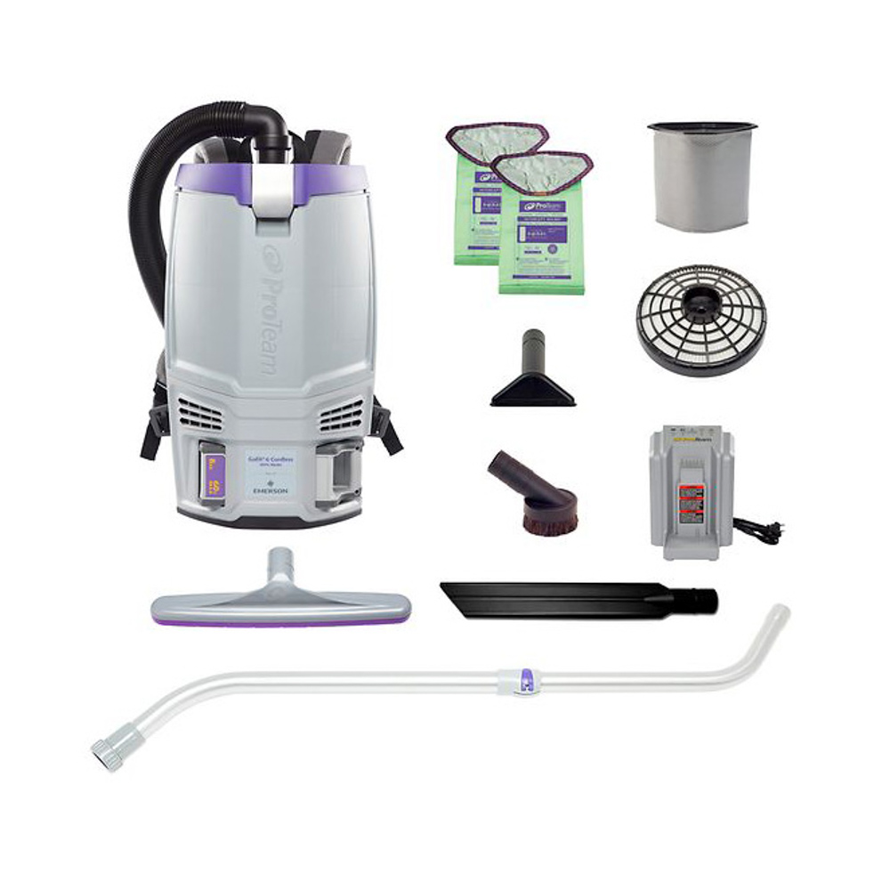 Discover the freedom of cordless vacuuming with ProTeam's GoFit 6 Cordless backpack vacuum that offers cordless efficiency, long runtimes and customized cleaning. Using the 6 qt. will increase your productivity by 30% compared to corded backpack vacuums, allowing you to maneuver around obstacles safely and quietly without the restrictions of a cord. With a larger capacity than its smaller counterpart, the GoFit 6 Cordless is ideal for those needing to tackle longer cleaning jobs. It weighs only 16.4 lbs. with the 8Ah battery installed, so it's comfortable to wear for long periods of time. This backpack vacuum includes a high/low power switch for controlling the power setting, giving you an extended runtime of approximately 106 minutes on low and approximately 83 minutes on high. Since personalized comfort is crucial especially for longer cleaning jobs, the 6 qt. features a 4-step quick-adjust FlexFit harness designed to be easily adjusted with no tools required. It also has advanced multi-layered ProLevel Filtration with HEPA Media that reduces allergens in the air and a brushless motor that prevents carbon dust.