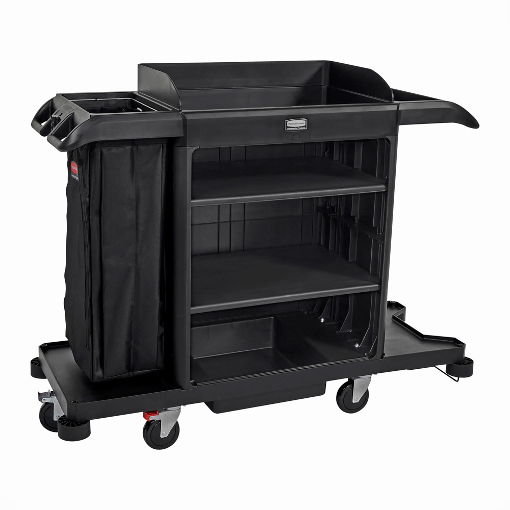 The Full Size Housekeeping Cart delivers a complete solution for efficient housekeeping, featuring 360-degree maneuverability, expanded storage, and customizable organization. Five swivel casters provide smooth control in tight spaces, while a fifth caster toggles between fixed and swivel modes for added stability. Two adjustable shelves, including a top shelf sized for standard glassware racks, maximize flexibility. With 20 percent more top surface area and greater cabinet capacity, it reduces trips to storage closets and improves workflow.