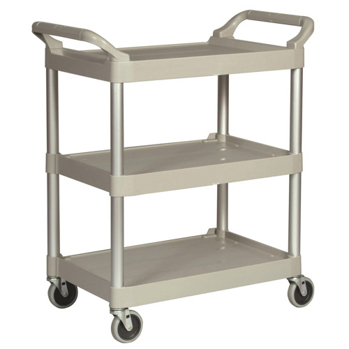 The Service Utility Cart with 4 in swivel casters provides durable, versatile transport for tools and supplies. Its molded shelves resist rust, dents, chips, and peeling, while smooth surfaces allow for quick cleaning. Non-marking casters ensure quie