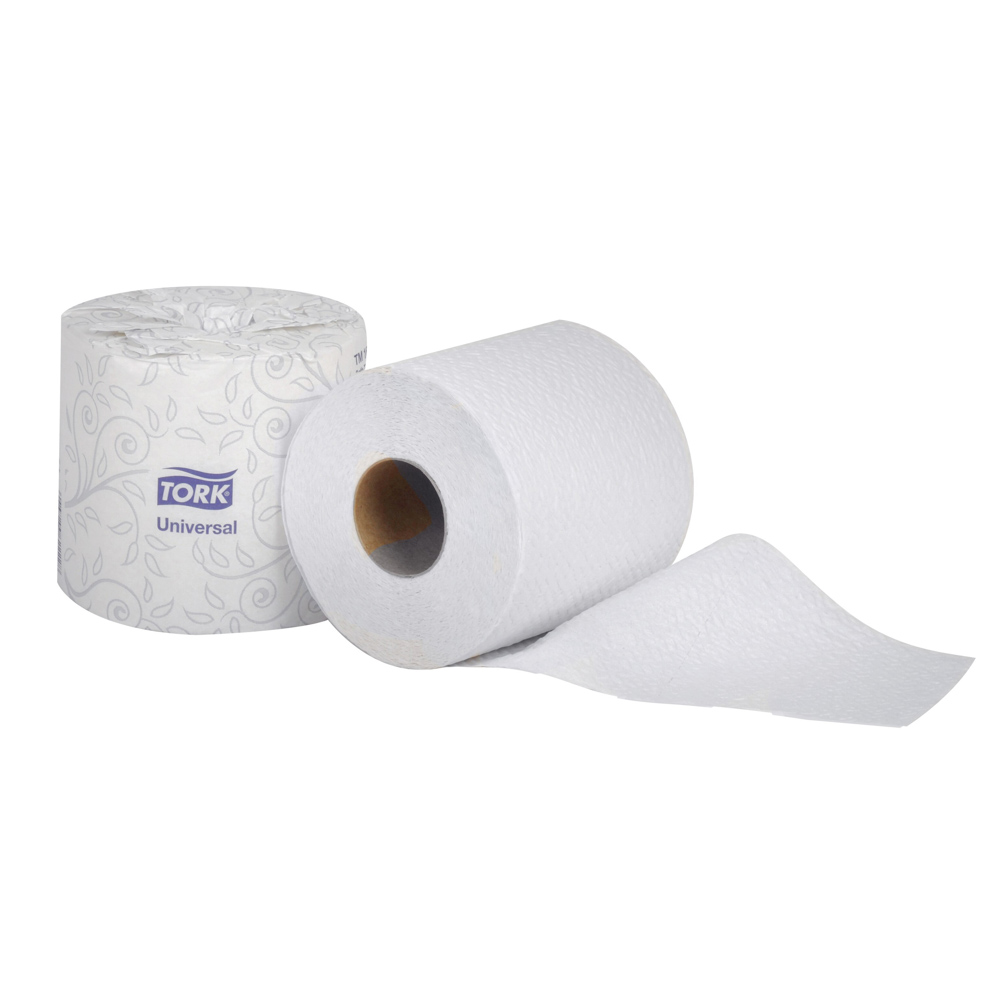"Tork Universal 2-Ply Bath Tissue is an absorbent economical bath tissue that delivers value and performance while embossed to enhance bulk and softness. Special tightly wound rolls and easy start tail seals to prevent waste and aid in source reduction. Each roll is elegantly wrapped ensuring sanitary protection while delivering quality, value, and performance. Tork bath tissue has rapid breakup, ideal for all plumbing systems. Made from 100% recycled fiber, minimum 20% post-consumer fibers, providing environmental benefits and a positive image builder. ECOLOGO Certified; EPA Compliant"